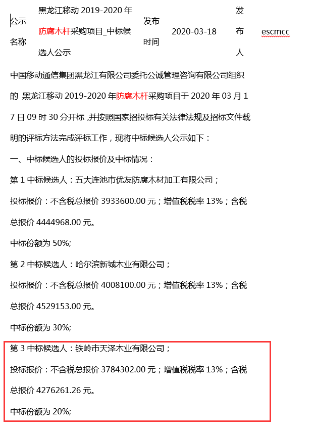 天澤木業(yè)在黑龍江移動(dòng)新年度防腐木桿采購項(xiàng)目中中標(biāo)